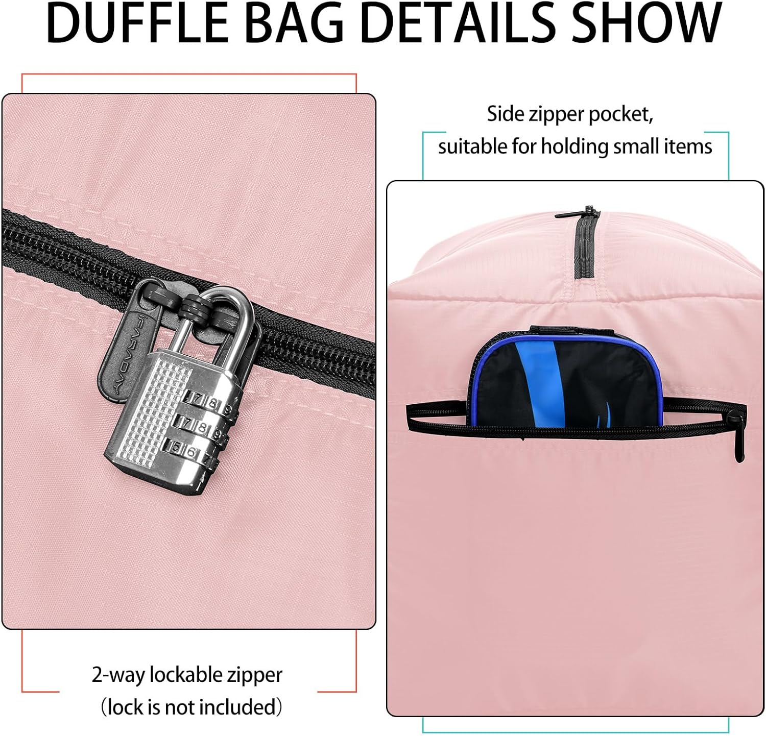 - LIGHTWEIGHT & LARGE CAPACITY: Up to 75L capcacity with one side zipper pocket, total weight of this duffel bag is only about 0.52lbs.